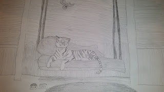 Took a few hours to sketch. Was basically just studying a photo of a tiger while sketching it to help make it look a bit more realistic. After drawing the tiger, I started drawing the sofa swing, balcony, food & water bowls, and a little bird soaring in the beautiful sky. I also tried slightly brushing over various parts with my pencil for shadows.